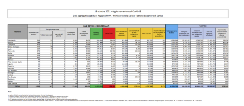 Come di consueto il ministero della Salute, di concerto con l’Istituto Superiore di Sanità e le amministrazioni delle singole regioni, ha diramato il bilancio dell’emergenza coronavirus aggiornato a mercoledì 13 ottobre.