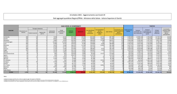 Come di consueto il ministero della Salute, di concerto con l’Istituto Superiore di Sanità e le amministrazioni delle singole regioni, ha diramato il bilancio dell’emergenza coronavirus aggiornato a giovedì 14 ottobre. Rispetto alla giornata precedente, in cui si erano verificati 2.772 contagi, sono stati registrati 2.668 casi positivi, 40 decessi e 3.709 guarigioni/dimissioni.