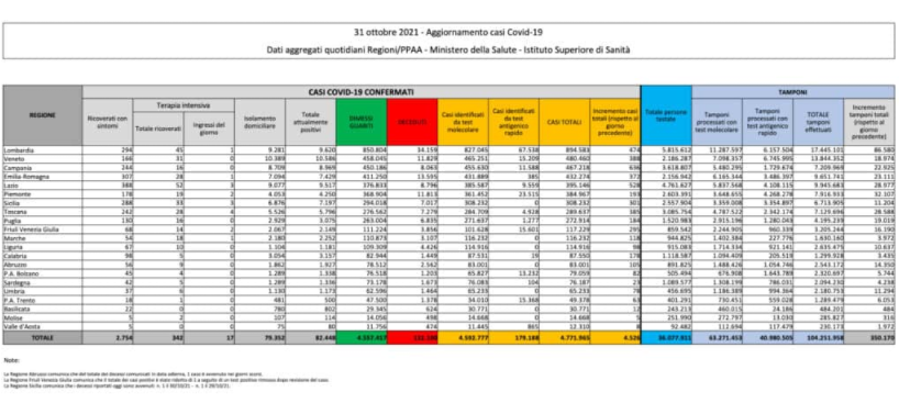 Le persone che hanno contratto il virus in Italia dall’inizio dell’epidemia sono 4.771.965. Di queste, 132.100 sono morte, mentre 4.557.417 sono guarite o sono state dimesse. L’ultimo bollettino registra 26 persone positive decedute (3 delle quali risultano da conteggi relativi ai giorni scorsi) e 4.526 nuovi casi accertati. I pazienti positivi al virus attualmente ricoverati in terapia intensiva sono 342 (4 in meno rispetto a ieri, i nuovi ingressi sono 17). I tamponi effettuati nelle ultime 24 ore sono 350.170. La Campania è la Regione con il maggior incremento di positivi in 24 ore: sono 636.