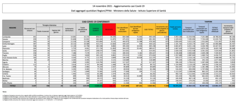 Le persone che hanno contratto il virus in Italia dall’inizio dell’epidemia sono 4.860.061. Di queste, 132.775 sono morte, mentre 4.608.056 sono guarite o sono state dimesse. L’ultimo bollettino registra 36 persone positive decedute (3 delle quali risultano da conteggi relativi ai giorni scorsi) e 7.569 nuovi casi accertati. I pazienti positivi al virus attualmente ricoverati in terapia intensiva sono 458 (5 in più rispetto a ieri, i nuovi ingressi sono 29). I tamponi effettuati nelle ultime 24 ore sono 445.593. La Lombardia è la Regione con il maggior incremento di positivi in 24 ore: sono 1.020.