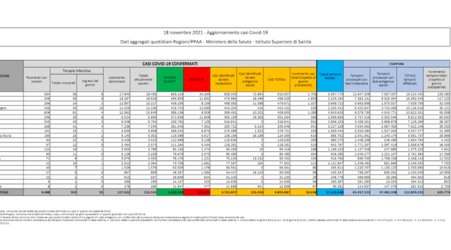 In Italia ci sono 10.638 nuovi casi di coronavirus a fronte di 625.774 tamponi effettuati (mentre il giorno prima l’incremento era stato di 10.172 su 537.765 test). Nelle ultime 24 ore sono stati registrati altri 69 decessi (contro i 72 di mercoledì) per un totale, da inizio pandemia, che arriva a 133.034. In terapia intensiva sono ricoverati 503 pazienti (+17) mentre i guariti sono 5.148. Tasso di positività all’1,7%.