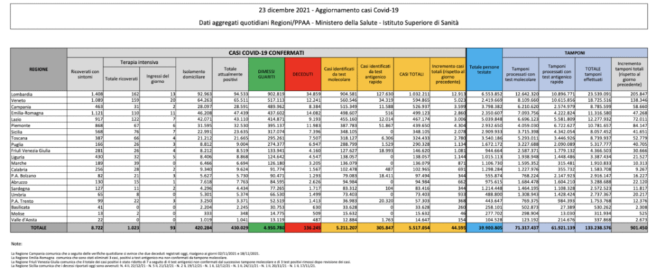 Le persone che hanno contratto il virus in Italia dall’inizio dell’epidemia sono 5.517.054. Di queste, 136.245 sono morte, mentre 4.950.780 sono guarite o sono state dimesse. L’ultimo bollettino registra 168 persone positive decedute (17 delle quali risultano da conteggi relativi ai giorni scorsi) e 44.595 nuovi casi accertati.