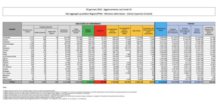 Le persone che hanno contratto il virus in Italia dall’inizio dell’epidemia sono 6.396.110 Di queste 137.786 sono morte, mentre 5.133.272 sono guarite o sono state dimesse.