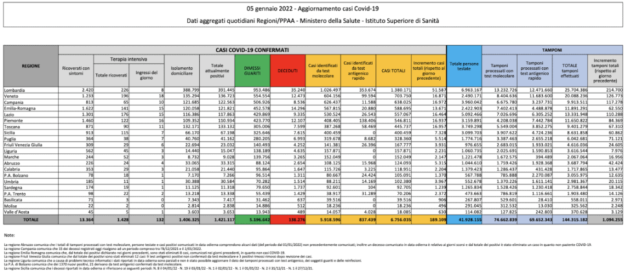 Le persone che hanno contratto il virus in Italia dall’inizio dell’epidemia sono 6.756.035. Di queste 138.276 sono morte, mentre 5.196.642 sono guarite o sono state dimesse. L’ultimo bollettino registra 231 persone positive decedute (48 delle quali risultano da conteggi relativi ai giorni scorsi) e 189.109 nuovi casi accertati. I pazienti positivi al virus attualmente ricoverati in terapia intensiva sono 1.428 (36 in più rispetto al giorno precedente, i nuovi ingressi sono 132). I tamponi effettuati nelle ultime 24 ore sono 1.094.255. La Lombardia è la Regione con il maggior incremento di positivi in 24 ore: sono 51.587.