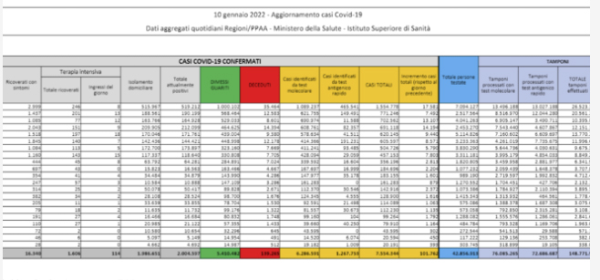 In Italia ci sono 101.762 nuovi casi di coronavirus a fronte di 612.821 tamponi effettuati (mentre il giorno prima l’incremento era stato di 155.659 con 993.201 test). Nelle ultime 24 ore sono stati registrati altri 227 decessi (contro i 157 di domenica) per un totale, da inizio pandemia, che arriva a 139.265. In terapia intensiva sono ricoverati 1.606 pazienti mentre i guariti sono 56.560. Tasso di positività al 16,6%.