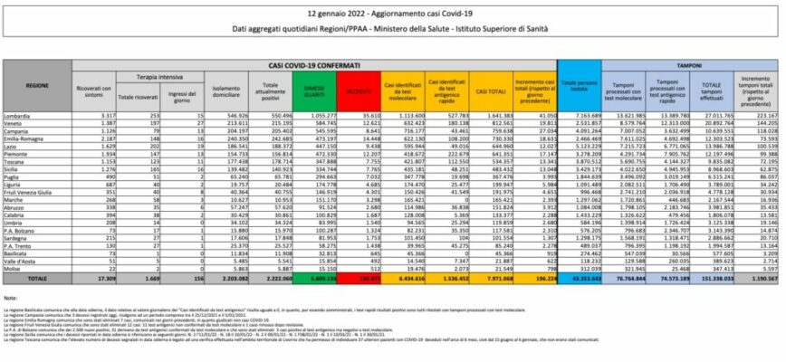 Le persone che hanno contratto il virus in Italia dall’inizio dell’epidemia sono 7.971.068 Di queste 139.872 sono morte, mentre 5.609.136 sono guarite o sono state dimesse. L’ultimo bollettino registra 313 persone positive decedute (28 delle quali risultano da conteggi relativi ai giorni scorsi) e 196.244 nuovi casi accertati. I pazienti positivi al virus attualmente ricoverati in terapia intensiva sono 1.669 (8 in meno rispetto al giorno precedente, i nuovi ingressi sono 156). I tamponi effettuati nelle ultime 24 ore sono 1.190.567. La Lombardia è la Regione con il maggior incremento di positivi in 24 ore: sono 41.050.