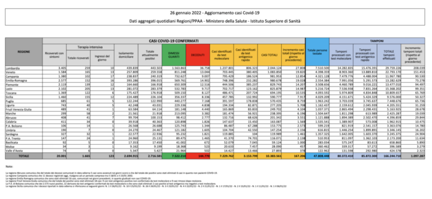 Le persone che hanno contratto il virus in Italia dall’inizio dell’epidemia sono 10.383.561. Di queste 144.770 sono morte, mentre 7.522.210 sono guarite o sono state dimesse. L’ultimo bollettino registra 426 persone positive decedute (67 delle quali risultano da conteggi relativi ai giorni scorsi) e 167.206 nuovi casi accertati. I pazienti positivi al virus attualmente ricoverati in terapia intensiva sono 1.665 (25 in meno rispetto al giorno precedente, i nuovi ingressi sono 123). I tamponi effettuati nelle ultime 24 ore sono 1.097.287. La Lombardia è la Regione con il maggior incremento di positivi in 24 ore: sono 27.808.