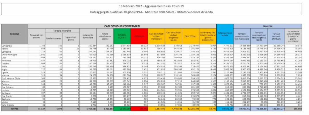 Il bollettino nazionale diffuso dalla Protezione civile e dal ministero della Salute sui dati Covid in Italia registra per le ultime 24 ore 59.749 nuovi positivi. Un dato in calo rispetto a quello segnalato ieri, quando i contagi erano stati 70.852. Anche sul fronte dei decessi la curva registra un decremento: sono 278 i morti legati al virus nell’ultima giornata contro i 388 del precedente monitoraggio. Gli attualmente positivi scendono a quota 1.480.113 (ieri 1.550.410).