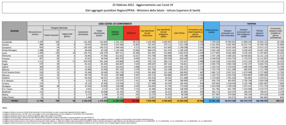 Le persone che hanno contratto il virus in Italia dall’inizio dell’epidemia sono 12.693.320. Di queste 154.206 sono morte, mentre 11.363.190 sono guarite o sono state dimesse.