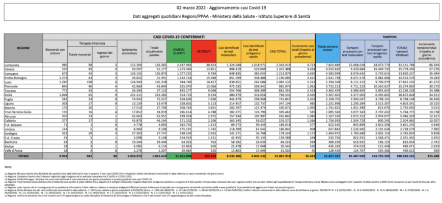 Le persone che hanno contratto il virus in Italia dall’inizio dell’epidemia sono 12.867.918. Di queste 155.214 sono morte, mentre 11.651.094 sono guarite o sono state dimesse. L’ultimo bollettino registra 214 persone positive decedute (42 delle quali risultano da conteggi relativi ai giorni scorsi) e 36.429 nuovi casi accertati. I pazienti positivi al virus attualmente ricoverati in terapia intensiva sono 681 (27 in meno rispetto al giorno precedente, i nuovi ingressi sono 40). I tamponi effettuati nelle ultime 24 ore sono 415.288. La Lombardia è la Regione con il maggior incremento di positivi in 24 ore: sono 4.713.