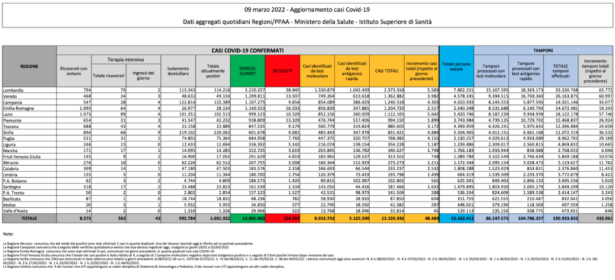 Le persone che hanno contratto il virus in Italia dall’inizio dell’epidemia sono 13.159.342. Di queste 156.357 sono morte, mentre 12.001.063 sono guarite o sono state dimesse. L’ultimo bollettino registra 156 persone positive decedute (29 delle quali risultano da conteggi relativi ai giorni scorsi) e 48.483 nuovi casi accertati. I pazienti positivi al virus attualmente ricoverati in terapia intensiva sono 563 (29 in meno rispetto al giorno precedente, i nuovi ingressi sono 43). I tamponi effettuati nelle ultime 24 ore sono 433.961. Il Lazio è la Regione con il maggior incremento di positivi in 24 ore: sono 5.642.