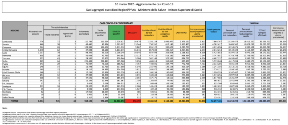 Le persone che hanno contratto il virus in Italia dall’inizio dell’epidemia sono 13.214.498. Di queste 156.493 sono morte, mentre 12.086.850 sono guarite o sono state dimesse. L’ultimo bollettino registra 136 persone positive decedute (29 delle quali risultano da conteggi relativi ai giorni scorsi) e 54.230 nuovi casi accertati. I pazienti positivi al virus attualmente ricoverati in terapia intensiva sono 545 (18 in meno rispetto al giorno precedente, i nuovi ingressi sono 48). I tamponi effettuati nelle ultime 24 ore sono 453.341. Il Lazio è la Regione con il maggior incremento di positivi in 24 ore: sono 6.136.