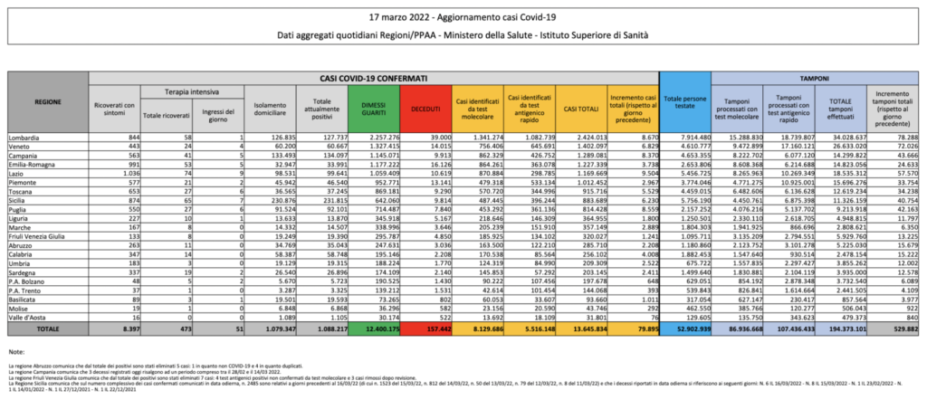 Le persone che hanno contratto il virus in Italia dall’inizio dell’epidemia sono 13.645.834. Di queste 157.442 sono morte, mentre 12.400.175 sono guarite o sono state dimesse. L’ultimo bollettino registra 128 persone positive decedute (21 delle quali risultano da conteggi relativi ai giorni scorsi) e 79.895 nuovi casi accertati. I pazienti positivi al virus attualmente ricoverati in terapia intensiva sono 473 (4 in meno rispetto al giorno precedente, i nuovi ingressi sono 51). I tamponi effettuati nelle ultime 24 ore sono 529.882. Il Lazio è la Regione con il maggior incremento di positivi in 24 ore: sono 9.504.