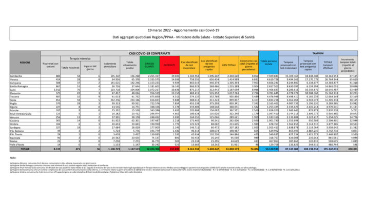 Nelle ultime 24 ore in Italia si sono registrati 48.385 nuovi casi di Coronavirus (ieri 76.250) e 85 decessi (ieri 165, e il giorno precedente 128) secondo i dati odierni del bollettino del Ministero della Salute e dalla Protezione Civile. Il totale dei casi registrati in Italia da inizio emergenza sale a quota 13.800.179, mentre i decessi per Covid sono stati complessivamente 157.692. Il numero degli attualmente positivi al virus è pari a 1.147.519 persone (ieri 1.120.221).