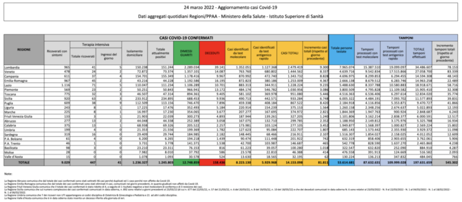 Le persone che hanno contratto il virus in Italia dall’inizio dell’epidemia sono 14.153.098. Di queste 158.436 sono morte, mentre 12.748.859 sono guarite o sono state dimesse. L’ultimo bollettino registra 182 persone positive decedute (18 delle quali risultano da conteggi relativi ai giorni scorsi) e 81.811 nuovi casi accertati. I pazienti positivi al virus attualmente ricoverati in terapia intensiva sono 447 (19 in meno rispetto al giorno precedente, i nuovi ingressi sono 41). I tamponi effettuati nelle ultime 24 ore sono 545.302. La Lombardia è la Regione con il maggior incremento di positivi in 24 ore: sono 9.300.