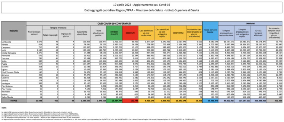 Le persone che hanno contratto il virus in Italia dall’inizio dell’epidemia sono 15.292.048. Di queste 160.748 sono morte, mentre 13.884.744 sono guarite o sono state dimesse. L’ultimo bollettino registra 90 persone positive decedute (10 delle quali risultano da conteggi relativi ai giorni scorsi) e 53.253 nuovi casi accertati. I pazienti positivi al virus attualmente ricoverati in terapia intensiva sono 465 (3 in più rispetto al giorno precedente, i nuovi ingressi sono 39). I tamponi effettuati nelle ultime 24 ore sono 352.265. La Lombardia è la Regione con il maggior incremento di positivi in 24 ore: sono 6.611.