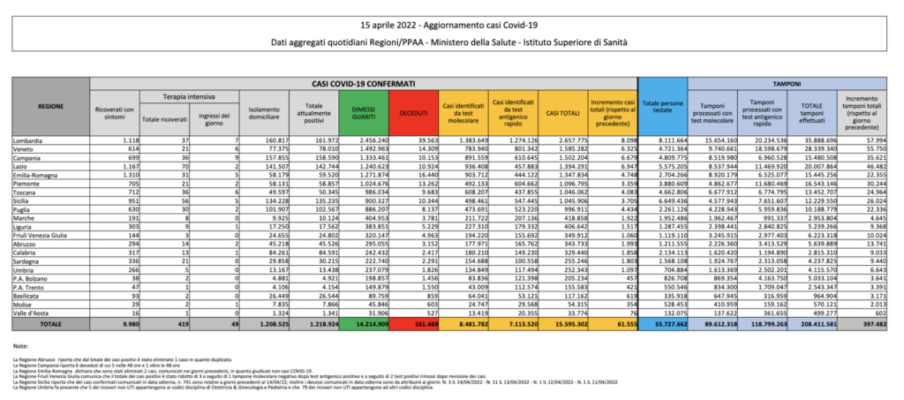Le persone che hanno contratto il virus in Italia dall’inizio dell’epidemia sono 15.595.302 Di queste 161.469 sono morte, mentre 14.214.909 sono guarite o sono state dimesse. L’ultimo bollettino registra 133 persone positive decedute (16 delle quali risultano da conteggi relativi ai giorni scorsi) e 61.555 nuovi casi accertati. I pazienti positivi al virus attualmente ricoverati in terapia intensiva sono 419 (1 in meno rispetto al giorno precedente, i nuovi ingressi sono 49). I tamponi effettuati nelle ultime 24 ore sono 397.482. La Lombardia è la Regione con il maggior incremento di positivi in 24 ore: sono 8.098.