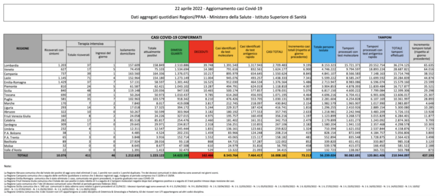 Le persone che hanno contratto il virus in Italia dall’inizio dell’epidemia sono 16.008.181. Di queste 162.466 sono morte, mentre 14.622.593 sono guarite o sono state dimesse. L’ultimo bollettino registra 202 persone positive decedute (36 delle quali risultano da conteggi relativi ai giorni scorsi) e 73.212 nuovi casi accertati. I pazienti positivi al virus attualmente ricoverati in terapia intensiva sono 411 (4 in meno rispetto al giorno precedente, i nuovi ingressi sono 46). I tamponi effettuati nelle ultime 24 ore sono 437.193. La Lombardia è la Regione con il maggior incremento di positivi in 24 ore: sono 9.195.