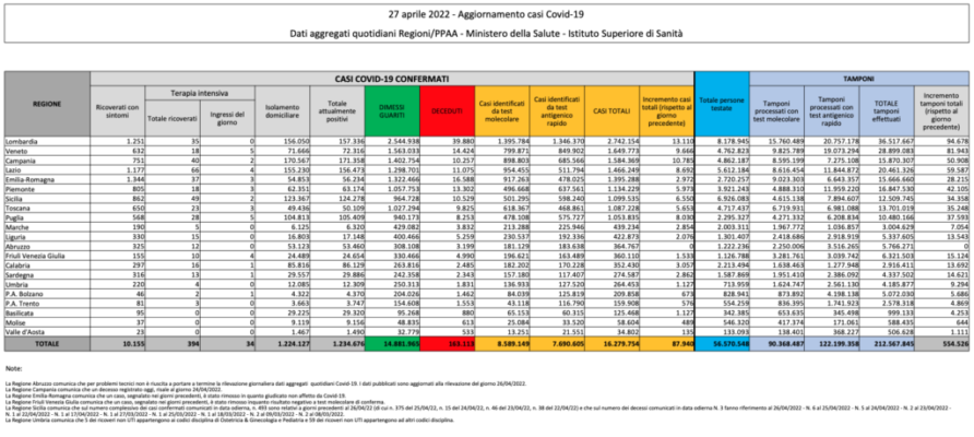 Le persone che hanno contratto il virus in Italia dall’inizio dell’epidemia sono 16.279.754. Di queste 163.113 sono morte, mentre 14.881.965 sono guarite o sono state dimesse. L’ultimo bollettino registra 186 persone positive decedute (26 delle quali risultano da conteggi relativi ai giorni scorsi) e 87.940 nuovi casi accertati. I pazienti positivi al virus attualmente ricoverati in terapia intensiva sono 394 (15 in meno rispetto al giorno precedente, i nuovi ingressi sono 34). I tamponi effettuati nelle ultime 24 ore sono 554.526. La Lombardia è la Regione con il maggior incremento di positivi in 24 ore: sono 13.110.