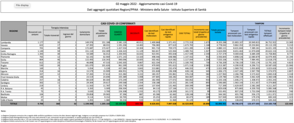 Le persone che hanno contratto il virus in Italia dall’inizio dell’epidemia sono 16.523.859. Di queste 163.736 sono morte, mentre 15.155.021 sono guarite o sono state dimesse. L’ultimo bollettino registra 124 persone positive decedute (16 delle quali risultano da conteggi relativi ai giorni scorsi) e 18.896 nuovi casi accertati. I pazienti positivi al virus attualmente ricoverati in terapia intensiva sono 368(2 in più rispetto al giorno precedente, i nuovi ingressi sono 32). I tamponi effettuati nelle ultime 24 ore sono 122.444. L’Emilia-Romagna è la Regione con il maggior incremento di positivi in 24 ore: sono 2.540.