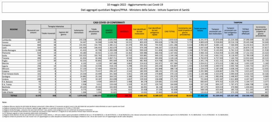 Le persone che hanno contratto il virus in Italia dall’inizio dell’epidemia sono 16.872.618. Di queste 164.731 sono morte, mentre 15.624.915 sono guarite o sono state dimesse. L’ultimo bollettino registra 158 persone positive decedute (26 delle quali risultano da conteggi relativi ai giorni scorsi) e 56.015 nuovi casi accertati. I pazienti positivi al virus attualmente ricoverati in terapia intensiva sono 358 (5 in meno rispetto al giorno precedente, i nuovi ingressi sono 27). I tamponi effettuati nelle ultime 24 ore sono 371.221. La Lombardia è la Regione con il maggior incremento di positivi in 24 ore: sono 9.481.