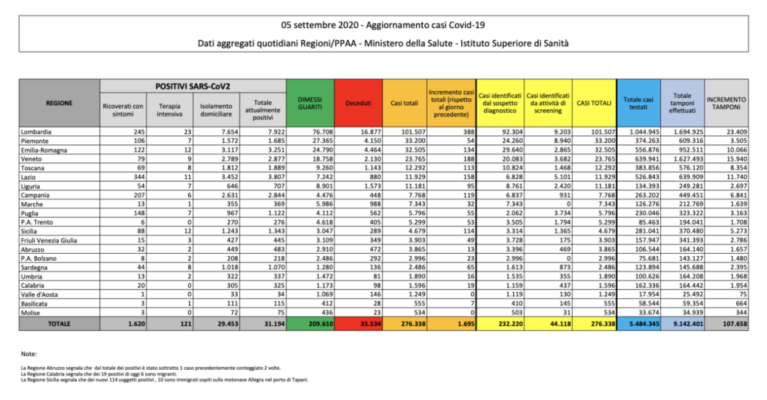Il totale delle persone che in Italia hanno contratto la malattia è pari a 276.338. I tamponi analizzati nelle ultime 24 ore sono stati 107.658, portando il computo complessivo dei test a quota 9.142.401. È quanto emerge dal bollettino pubblicato dalla Protezione Civile.