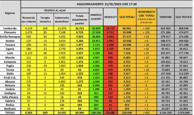 Come di consueto, anche nella serata del 21 maggio la Protezione Civile ha reso noti i dati relativi alle ultime 24 ore. Sono stati effettuati 71.679 nuovi tamponi e trovati 642 nuovi positivi al COVID-19. Rispetto a ieri, il numero di positivi è calato di 1.792 unità: attualmente in Italia sono 60.960. Nelle ultime 24 ore sono morte 156 persone affette da coronavirus. Sale il numero di guariti: sono 134.560, +2.278 rispetto a ieri. Di seguito i dati.