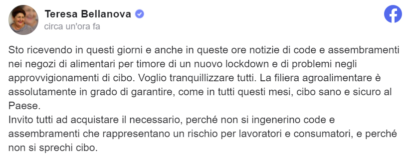 Teresa Bellanova ha informato di avere ricevuto “notizie di code e assembramenti nei negozi di alimentare per timore di un nuovo lockdown e di problemi negli approvvigionamenti”.