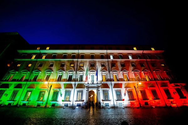 Coronavirus Italia, Palazzo Chigi illuminato dai colori del tricolore: “Uniti ce la faremo”