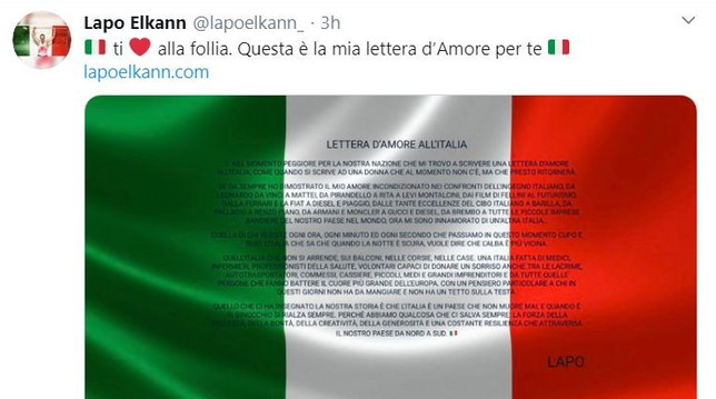 “Quello che ci ha insegnato la nostra storia è che l’Italia è un paese che non muore mai, e quando è in ginocchio si rialza sempre. Perché abbiamo qualcosa che ci salva sempre: la forza della bellezza, della bontà, della creatività, della generosità e una costante resilienza che attraversa il nostro paese da Nord a Sud”. Lo scrive Lapo Elkann, che ha pubblicato una “Lettera d’amore all’Italia”. Poi prosegue: “E’ nel momento peggiore per la nostra nazione che mi trovo a scrivere una lettera d’amore all’Italia, come quando si scrive ad una donna che al momento non c’è, ma che presto ritornerà. Se da sempre ho dimostrato il mio amore incondizionato nei confronti dell’ingegno italiano, da Leonardo da Vinci a Mattei, da Pirandello a Rita Levi Montalcini, dai film di Fellini al Futurismo, dalla Ferrari e la Fiat a Diesel e Piaggio, dalle tante eccellenze del cibo italiano a Barilla, da Palladio a Renzo Piano, da Armani e Moncler a Gucci e Diesel, da Brembo a tutte le piccole imprese bandiere del nostro paese nel mondo, ora mi sono innamorato di un’altra Italia, di chi resiste ogni ora, ogni minuto ed ogni secondo che passiamo in questo momento cupo e buio, l’Italia che sa che quando la notte è scura, vuole dire che l’alba è più vicina quell’Italia che non si arrende, sui balconi, nelle corsie, nelle case. Un’Italia fatta di medici, infermieri, professionisti della salute, volontari capaci di donare un sorriso anche tra le lacrime, autotrasportatori, commessi, cassiere, piccoli, medi e grandi imprenditori e da tutte quelle persone che fanno battere il cuore più grande dell’Europa. Con un pensiero particolare a chi in questi giorni non ha da mangiare e non ha un tetto sulla testa”.