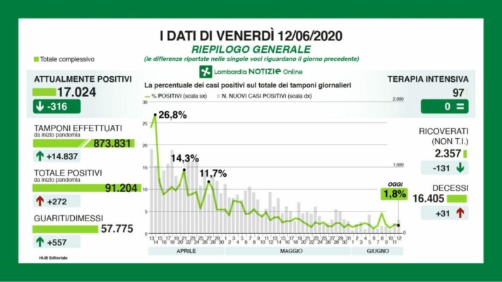 Continuano a calare i pazienti attualmente positivi al Coronavirus in tutta la Lombardia. Oggi sono 17.024, ieri 17.340, il giorno prima 17.857: si tratta di 316 pazienti in meno nelle ultime 24 ore. Se, invece, le vittime ieri erano 25, oggi sono 31. Il totale dei deceduti è arrivato a 16.405 (ieri 16.374). Il numero di casi positivi in più è, invece, 272 mentre ieri erano 252 per un totale di 91.204 casi dall’inizio della pandemia.