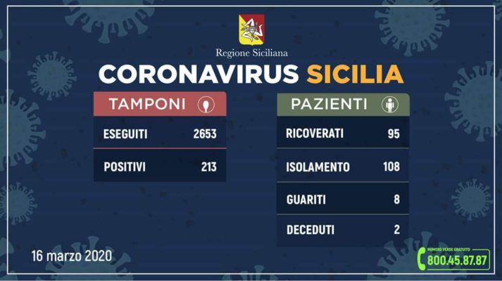 Salgono i positivi, ma soprattutto salgono i ricoverati, 24 in più rispetto a ieri. Questo il quadro riepilogativo della situazione nell’Isola, aggiornato alle ore 12 di oggi (lunedì 16 marzo), in merito all’emergenza Coronavirus, così come comunicato dalla Regione Siciliana all’Unità di crisi nazionale. “Dall’inizio dei controlli, i tamponi validati dai laboratori regionali di riferimento (Policlinici di Palermo e Catania) sono 2.653, sono stati trasmessi all’Istituto superiore di sanità, invece, 213 campioni (25 più di ieri). Risultano ricoverati 95 pazienti (18 a Palermo, 42 a Catania, 10 a Messina, 2 ad Agrigento, 3 a Caltanissetta, 4 a Enna, 2 a Ragusa, 8 a Siracusa e 6 a Trapani) di cui 20 in terapia intensiva, mentre 108 sono in isolamento domiciliare, otto sono guariti (tre a Palermo, due ad Agrigento, uno a Enna, Messina e Ragusa) e due deceduti”.