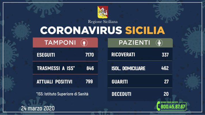 Questo il quadro riepilogativo della situazione nell’Isola, aggiornato alle ore 12 di oggi (martedì 24 marzo), in merito all’emergenza Coronavirus, così come comunicato dalla Regione Siciliana all’Unità di crisi nazionale.