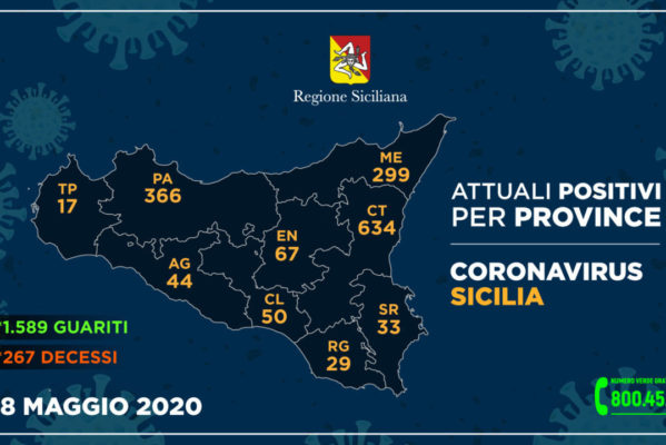 In Sicilia sedici positivi in meno. Questa la divisione degli attuali positivi nelle varie province: Agrigento, 44 (0 ricoverati, 96 guariti e 1 deceduto); Caltanissetta, 50 (6, 109, 11); Catania, 634 (45, 331, 96); Enna, 67 (7, 325, 29); Messina, 299 (44, 205, 56); Palermo, 366 (36, 163, 34); Ragusa, 29 (4, 58, 7); Siracusa, 33 (8, 185, 28); Trapani, 17 (0, 117, 5).