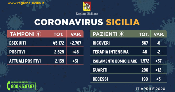 Questo il quadro riepilogativo della situazione nell’Isola, aggiornato alle ore 17 di oggi (venerdì 17 aprile), in merito all’emergenza Coronavirus, così come comunicato dalla Regione Siciliana all’Unità di crisi nazionale. Dall’inizio dei controlli, i tamponi effettuati sono stati 45.172 (+2.767 rispetto a ieri). Di questi sono risultati positivi 2.625 (+46), mentre, attualmente, sono ancora contagiate 2.139 persone (+31), 296 sono guarite (+12) e 190 decedute (+3). Degli attuali 2.139 positivi, 567 pazienti (-6) sono ricoverati – di cui 46 in terapia intensiva (-2) – mentre 1.572 (+37) sono in isolamento domiciliare. Il prossimo aggiornamento regionale avverrà domani. Lo comunica la presidenza della Regione Siciliana.