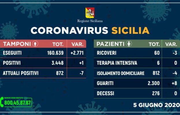 Questo il quadro riepilogativo della situazione nell’Isola, aggiornato alle ore 15 di oggi 5 giugno, in merito all’emergenza Coronavirus, così come comunicato dalla Regione Siciliana all’Unità di crisi nazionale.