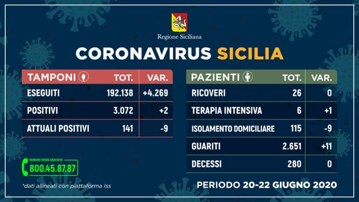 Questo il quadro riepilogativo della situazione nell’Isola negli ultimi tre giorni (20-22 giugno) e aggiornato alle ore 17 di oggi, in merito all’emergenza Coronavirus, così come comunicato dalla Regione Siciliana all’Unità di crisi nazionale.