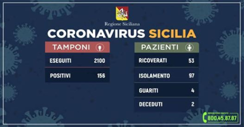 In alto il quadro riepilogativo della situazione in Sicilia, aggiornato alle ore 12 di oggi sabato 14 marzo, in merito all’emergenza Coronavirus, così come comunicato dalla Regione Siciliana all’Unità di crisi nazionale. Dall’inizio dei controlli, i tamponi validati dai laboratori regionali di riferimento sono 2.100, sono stati trasmessi all’Istituto superiore di sanità, invece, 156 campioni, 26 in più rispetto alla giornata di ieri. Risultano ricoverati 53 pazienti di cui 11 in terapia intensiva, mentre 97 sono in isolamento domiciliare, quattro sono guariti e due deceduti. Il prossimo aggiornamento avverrà domani. Lo comunica la presidenza della Regione Siciliana. Si raccomanda di attenersi scrupolosamente alle indicazioni fornite dal ministero della Salute per contenere la diffusione del virus. Per ulteriori approfondimenti visitare il sito dedicato www.siciliacoronavirus.it o chiamare il numero verde 800.45.87.87