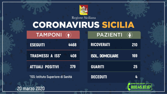 Dall’inizio dei controlli, i tamponi validati dai laboratori regionali di riferimento (Policlinici di Palermo e Catania) sono 4.468. Attualmente risultano positive 379 persone.