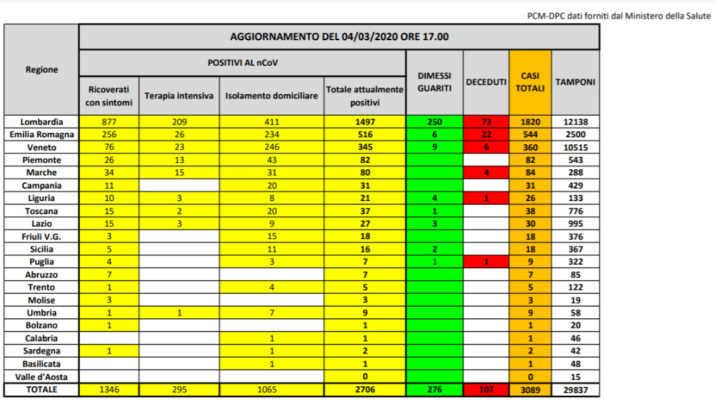 Salgono a 3089 i casi di contagio da coronavirus registrati finora in Italia, secondo l’ultimo aggiornamento del capo della Protezione civile Angelo Borrelli, sulla base dei numeri forniti dal ministero della Salute e dalle singole Regione. Le vittime finora registrate sono 107, con un balzo rispetto ai dati di ieri di 28 nuovi pazienti morti. I malati attualmente positivi sono 2706, mentre rispetto a ieri sono stati 116 i guariti, con un aumento del 72,5%, per un totale di 276. Sono 295 i malati con il coronavirus ricoverati in terapia intensiva, 66 in più rispetto a ieri.