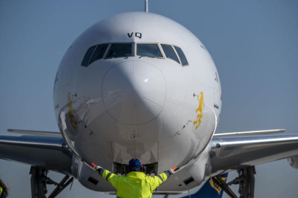 L'arrivo di uno dei due aerei provenienti dalla Cina con una spedizione di 11 milioni di mascherine, 400mila kit per i test, 230 maschere per i respiratori, 1.000 mascherine da isolamento, 100 monitor e 80mila tute sanitarie, Pisa, 3 Aprile 2020. I dispositivi sanitari, acquistati in gran parte da Regione Toscana e Fondazione Ente Cassa di Risparmio di Firenze, per un valore complessivo di oltre 20 milioni di euro, saranno distribuiti negli ospedali toscani per fronteggiare l’emergenza Covid-19. ANSA/CLAUDIO GIOVANNINI