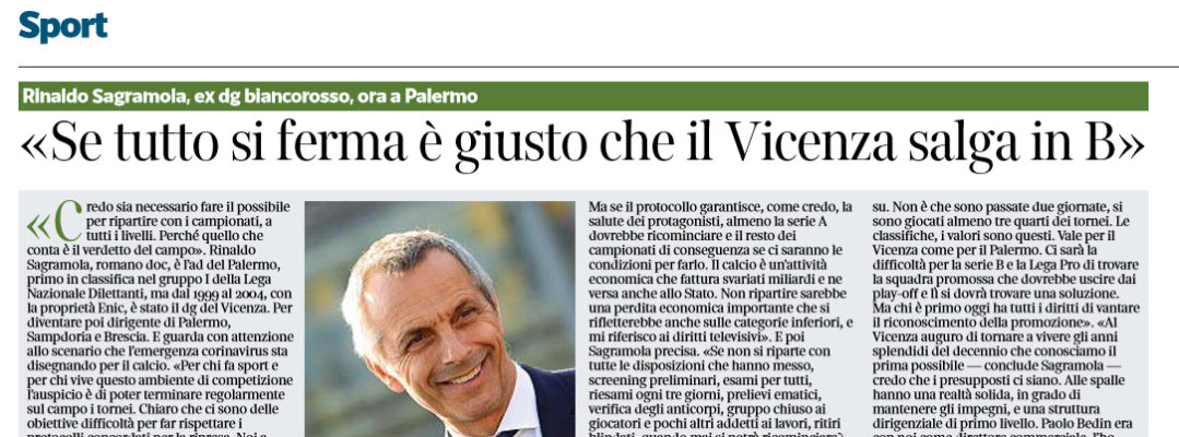 L’edizione odierna de “Il Corriere Veneto” ha intervistato Rinaldo Sagramola, il quale si è espresso in merito all’emegerneza Coronavirus e sull’eventuale ripresa dei campionati. Ecco quanto si legge: «Credo sia necessario fare il possibile per ripartire con i campionati, a tutti i livelli. Perché quello che conta è il verdetto del campo. Per chi fa sport e per chi vive questo ambiente di competizione l’auspicio è di poter terminare regolarmente sul campo i tornei. Chiaro che ci sono delle obiettive difficoltà per far rispettare i protocolli concordati per la ripresa. Noi a Palermo abbiamo le strutture e i mezzi per far fronte a questo tipo di impegno, ma non so quante altre società lo sarebbero nella nostra categoria e quindi credo sia difficile riprendere per noi. Così come in Lega Pro mi pare di capire che ci siano evidenti problemi. Ma se il protocollo garantisce, come credo, la salute dei protagonisti, almeno la serie A dovrebbe ricominciare e il resto dei campionati di conseguenza se ci saranno le condizioni per farlo. Il calcio è un’attività economica che fattura svariati miliardi e ne versa anche allo Stato. Non ripartire sarebbe una perdita economica importante che si rifletterebbe anche sulle categorie inferiori, e mi riferisco ai diritti televisivi». Sagramola dal 1999 al 2004, con la proprietà Enic, è stato il dg del Vicenza, squadra prima in classifica del girone B di Serie C: «Se si fermano i campionati, è giusto che chi è in testa vada su. Non è che sono passate due giornate, si sono giocati almeno tre quarti dei tornei. Le classifiche, i valori sono questi. Vale per il Vicenza come per il Palermo. Ci sarà la difficoltà per la serie B e la Lega Pro di trovare la squadra promossa che dovrebbe uscire dai play-off e lì si dovrà trovare una soluzione. Ma chi è primo oggi ha tutti i diritti di vantare il riconoscimento della promozione».