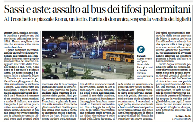 Corriere del Veneto: “Sassi e aste: assalto al bus dei tifosi palermitani”