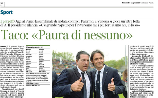“E’ il giorno. Venezia freme, Venezia aspetta, Venezia gode. E sogna un triplo salto che avrebbe dell’incredibile. C’è riuscito il Parma, ma il Venezia vuole fare il botto e oggi al Penzo arriverà al Penzo il Palermo di Maurizio Zamparini. Un presidente che da queste parti ha scritto la storia ma ha anche spaccato la piazza, con quella fusione della discordia di cui ancor oggi si discute. Nei bacari e nei campi, sui tribunali virtuali dei canali social, fra amici e semplici conoscenti. Joe Tacopina, però, non si ferma e rilancia. Lui i playoff sa come si vincono, sa come si fa. Perché li vinse a Bologna nel 2015 e vuole ripetersi oggi.