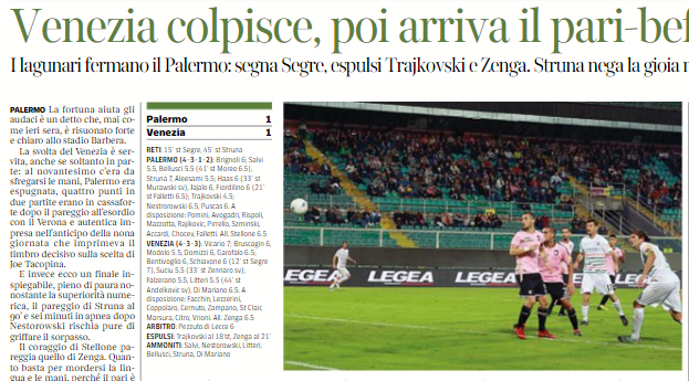 “La fortuna aiuta gli audaci è un detto che, mai come ieri sera, è risuonato forte e chiaro allo stadio Barbera. La svolta del Venezia è servita, anche se soltanto in parte: al novantesimo c’era da sfregarsi le mani, Palermo era espugnata, quattro punti in due partite erano in cassaforte dopo il pareggio all’esordio con il Verona e autentica impresa nell’anticipo della nona giornata che imprimeva il timbro decisivo sulla scelta di Joe Tacopina. E invece ecco un finale inspiegabile, pieno di paura nonostante la superiorità numerica, il pareggio di Struna al 90’ e sei minuti in apnea dopo Nestorowski rischia pure di griffare il sorpasso. Il coraggio di Stellone pareggia quello di Zenga. Quanto basta per mordersi la lingua e le mani, perché il pari è oggettivamente una mezza sconfitta. Lo ammette pure Maurizio Domizzi a fine gara: «Per come si era messa la partita questa è quasi una sconfitta — sospira il capitano davanti alle telecamere di Dazn — potevamo gestirla molto ma molto meglio. Eravamo andati in vantaggio ed eravamo in superiorità numerica. Ci dispiace tantissimo per il mister che si è approcciato benissimo con noi, sarebbe stato fondamentale portare a casa una vittoria, perché la classifica non è bella. La squadra c’è ed è viva, è in fiducia ed è col mister nonostante la classifica». Classifica ancora ansiogena, che avrebbe assunto tutto un altro aspetto in caso di successo. In laguna è cambiato tanto e pure i dettagli significano molto, perché il cambio Schiavone – Segre viene subito premiato sul campo. Il gol a tre minuti dall’ingresso del centrocampista scuola Milan sarà pure aiutato dalla deviazione di Haas, ma sul calcio d’angolo che porta al vantaggio l’indicazione di Zenga a Segre è chiara. Posizionarsi in quello spicchio di campo e tirare in porta sul pallone vagante che esce dall’area. Detto, fatto, la carambola è benigna, Brignoli battuto, il Palermo fuori controllo con i nervi. Poco dopo Trajkovski compie un fallaccio su Di Mariano, l’arbitro Pezzuto sceglie la linea dura e inflessibile, punendo la pericolosità dell’intervento. Il piano di Zenga è chiaro sin dall’inizio. Cercare di limitare le fonti di gioco del Palermo, impedendo il rifornimento a Nestorowski e Puscas, addormentare la partita riducendo sempre più i ritmi. Piano che riesce alla perfezione, perché è vero che nel primo tempo sul taccuino ci sono quasi solo occasioni per il Palermo, ma è altrettanto vero che l’onda d’urto tutto sommato viene retta più che discretamente. Si scopre pure che la chance forse più nitida è un quasi autogol di Aleesami su cross di Garofalo al 24’. Poi, certo, c’è l’ottimo Vicario a togliere dall’angolino il gran tiro di Jajalo nel finale di frazione. Col passare dei minuti, però, il Palermo perde lucidità e subisce il gol di Segre. Poi il convulso finale e l’amaro calice del pareggio”. Questo quanto scrive l’edizione odierna de il “Corriere del Veneto”: