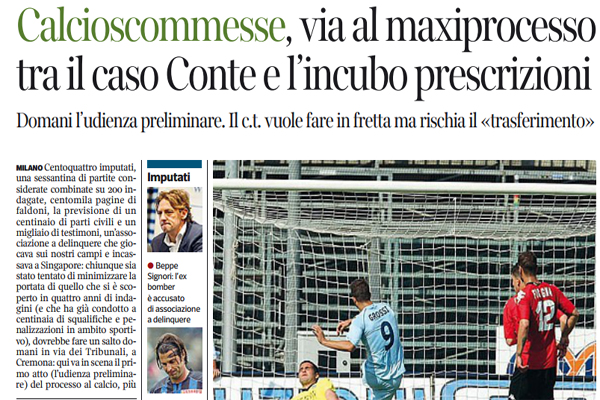 Corriere della Sera: “Calcioscommesse, via al maxiprocesso tra il caso Conte e l’incubo prescrizioni. Domani l’udienza, il c.t. vuole fare in fretta ma rischia il «trasferimento»”