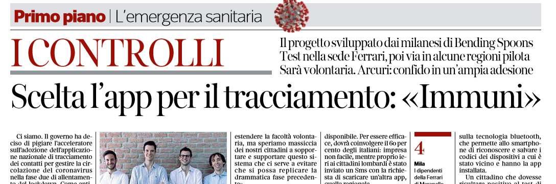 Corriere della Sera: “Coronavirus. Italia. Scelta l’app per il tracciamento: «Immuni». Ecco come funzionerà”