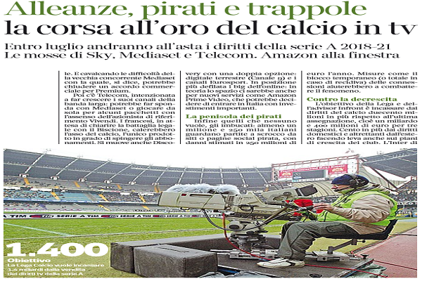 Corriere della Sera: “Diritti Tv: alleanze, pirati e trappole. La corsa all’oro del calcio in tv, a sorpresa spunta anche Amazon?”