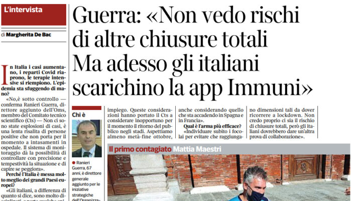 Corriere della Sera: “Guerra «Non vedo rischi di altre chiusure totali. Ma adesso gli italiani scarichino la app Immuni»”