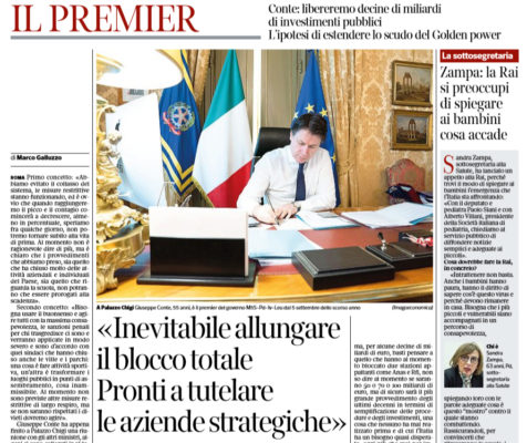 L’edizione odierna del “Corriere della Sera” riporta le dichiarazioni di Giuseppe Conte, presidente del Consiglio: «Abbiamo evitato il collasso del sistema, le misure restrittive stanno funzionando, ed è ovvio che quando raggiungeremo il picco e il contagio comincerà a decrescere, almeno in percentuale, speriamo fra qualche giorno, non potremo tornare subito alla vita di prima. I provvedimenti che abbiamo preso, sia quello che ha chiuso molte delle attività aziendali e individuali del Paese, sia quello che riguarda la scuola, non potranno che essere prorogati alla scadenza. Bisogna usare il buonsenso e agire tutti con la massima consapevolezza, le sanzioni penali per chi trasgredisce ci sono e verranno applicate in modo severo e sono d’accordo con quei sindaci che hanno chiuso anche le ville e i parchi: una cosa è fare attività sportiva, un’altra è trasformare i luoghi pubblici in punti di assembramento, cosa inammissibile. Al momento non sono previste altre misure restrittive di largo respiro, ma se non saranno rispettati i divieti dovremo agire. Noi siamo più che soddisfatti di tutti i passi compiuti sino ad ora, passi che si sono ispirati ad almeno quattro principi: trasparenza, perché non nascondiamo nulla ai cittadini, e chi lo fa in altri Paesi rischia di pentirsene amaramente; massimo rigore, perché non abbiamo sottovalutato nulla e assunto sempre gli scenari peggiori come indicatori; adeguatezza delle misure e infine proporzionalità, senza la quale gli italiani, abituati ad un grande individualismo e a radicate libertà civili, non avrebbero retto, visto che non siamo in Cina e non viviamo in uno Stato centralizzato». Il capo del governo rivela anche che è in dirittura d’arrivo – «penso fra due settimane saremo pronti per firmarlo» —anche un altro decreto, quella leva di politica economica interna, che nessuna iniezione di liquidità può sostituire e che per decenni è stato il tallone d’Achille della crescita italiana. «Di sicuro sarà il più grande provvedimento degli ultimi decenni in termini di semplificazione delle procedure e degli investimenti, una cosa che nessuno ha mai realizzato prima e di cui l’Italia ha un bisogno quasi disperato».